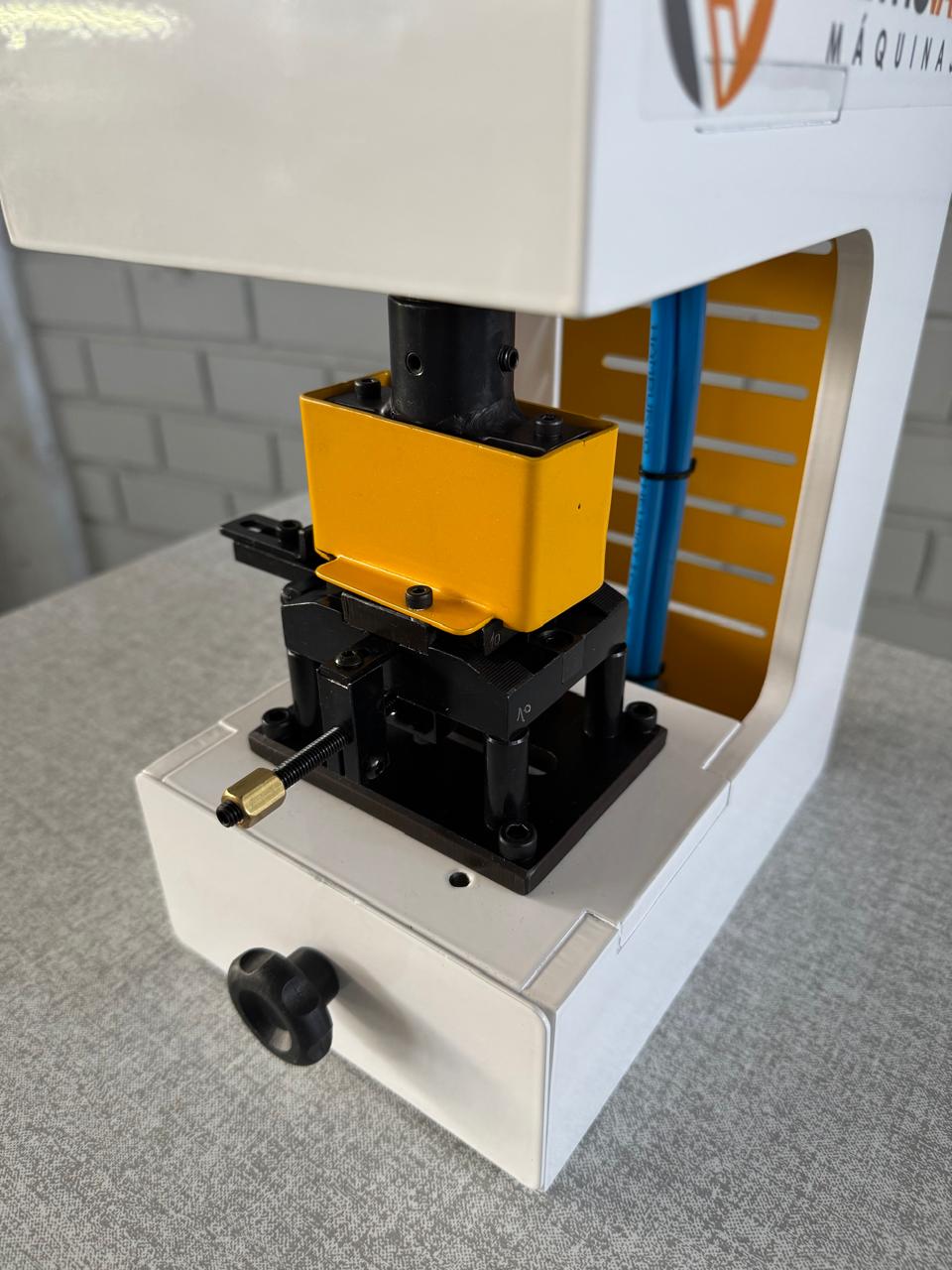 Usa matriz com pinos em aço de alta dureza de 2mm de diâmetro e distância entre eles de 8mm, podendo ser ajustada de 1 a 7 vazadores